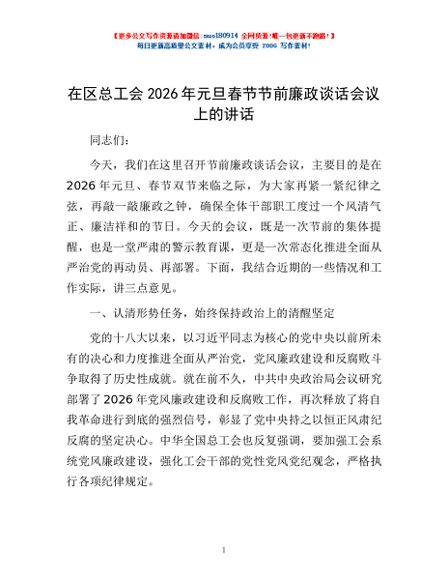 / 在区总工会2026年元旦春节节前廉政谈话会议上的讲话