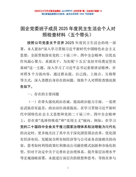 / 国企党委班子成员2025年度民主生活会个人对照检查材料(五个带头)