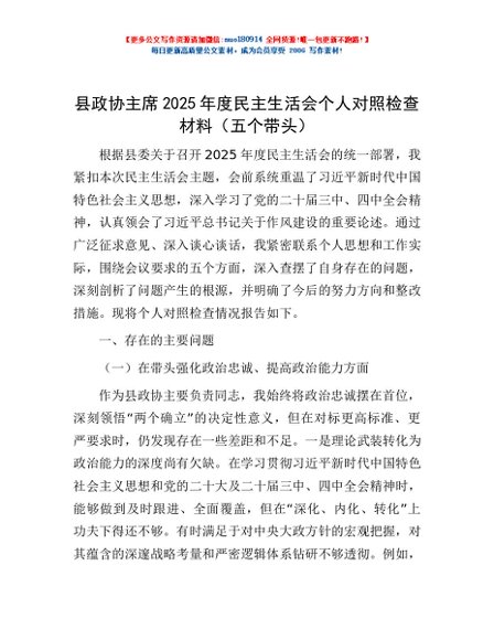 / 县政协主席2025年度民主生活会个人对照检查材料(五个带头)