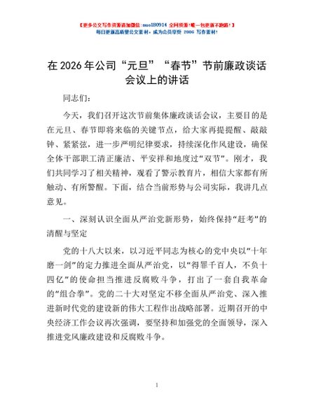 / 在2026年公司“元旦”“春节”节前廉政谈话会议上的讲话
