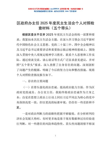 / 区政府办主任2025年度民主生活会个人对照检查材料(五个带头)