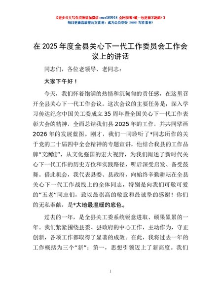 / 在2025年度全县关心下一代工作委员会工作会议上的讲话