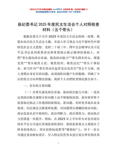 / 县纪委书记2025年度民主生活会个人对照检查材料(五个带头)