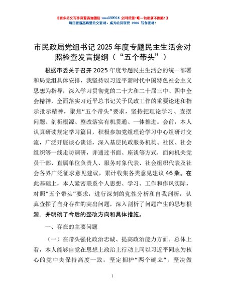 / 市民政局党组书记2025年度专题民主生活会对照检查发言提纲(“五个带头”)