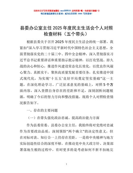 / 县委办公室主任2025年度民主生活会个人对照检查材料(五个带头)