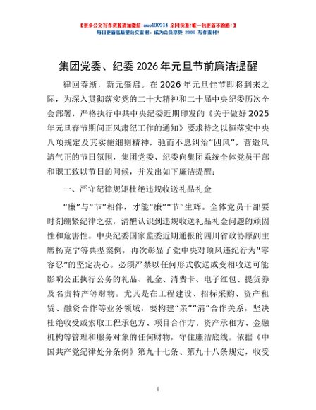/ 集团党委、纪委2026年元旦节前廉洁提醒