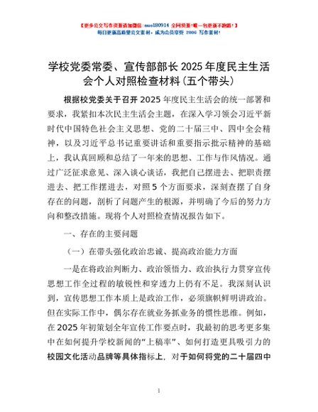 / 学校党委常委、宣传部部长2025年度民主生活会个人对照检查材料(五个带头)
