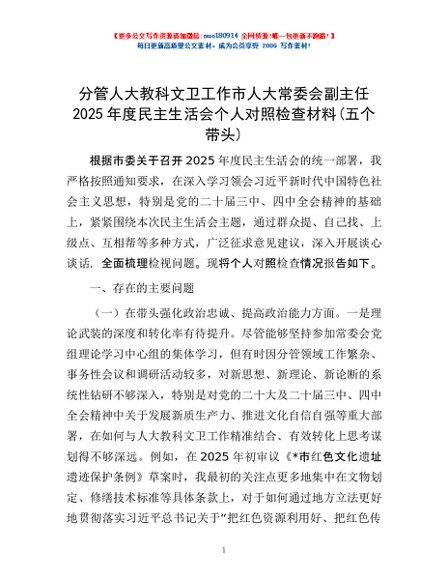/ 分管人大教科文卫工作市人大常委会副主任2025年度民主生活会个人对照检查材料(五个带头)