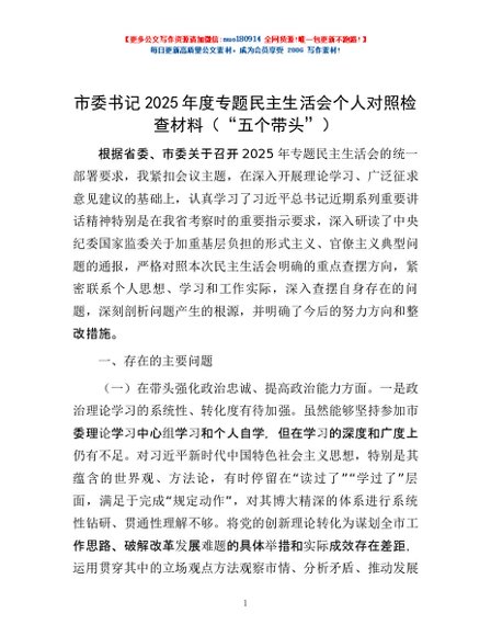 / 市委书记2025年度专题民主生活会个人对照检查材料(“五个带头”)