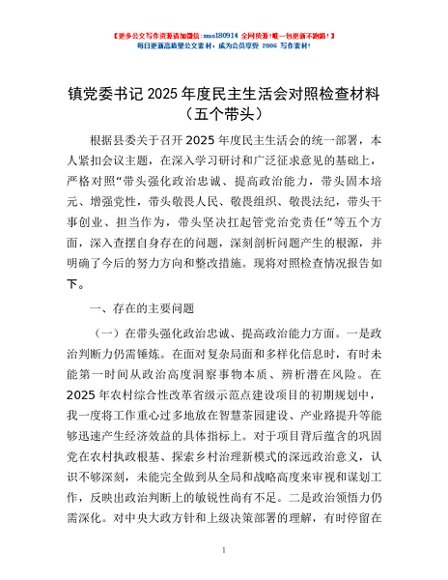 / 镇党委书记2025年度民主生活会对照检查材料(五个带头)