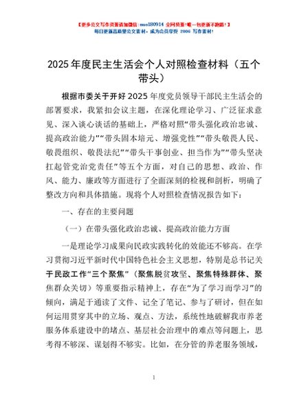 / 2025年度民主生活会个人对照检查材料(五个带头)