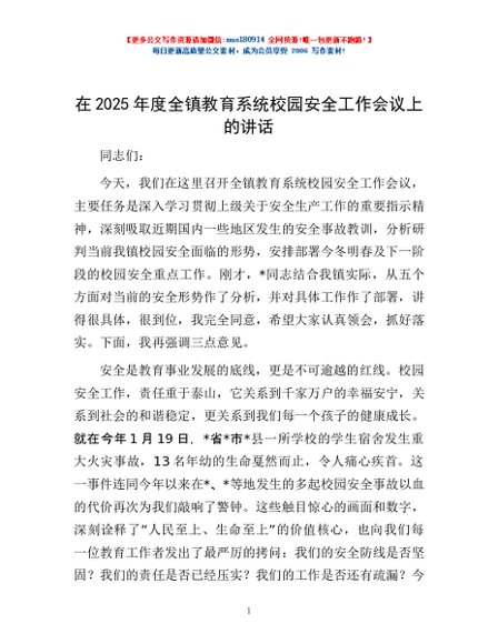 / 在2025年度全镇教育系统校园安全工作会议上的讲话