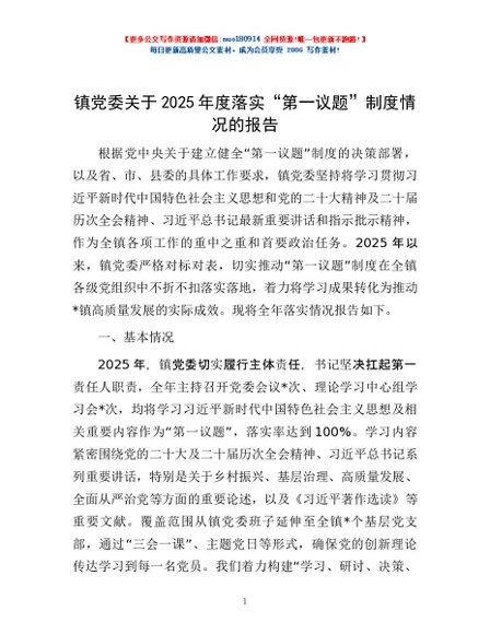 / 镇党委关于2025年度落实“第一议题”制度情况的报告
