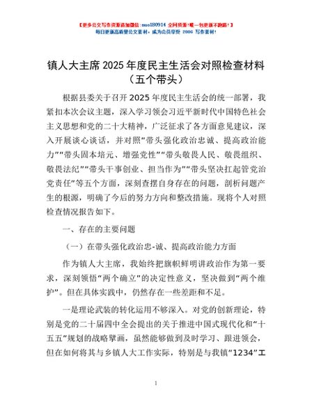 / 镇人大主席2025年度民主生活会对照检查材料(五个带头)