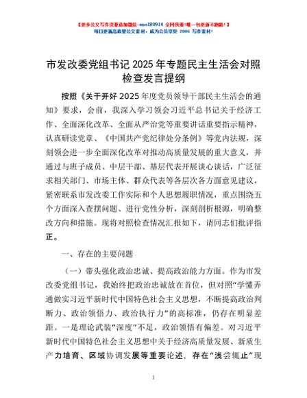 / 市发改委党组书记2025年专题民主生活会对照检查发言提纲