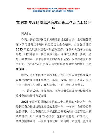 / 在2025年度区委党风廉政建设工作会议上的讲话