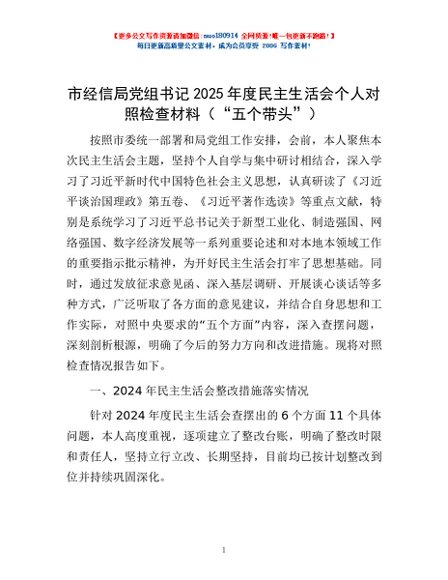 / 市经信局党组书记2025年度民主生活会个人对照检查材料(“五个带头”)