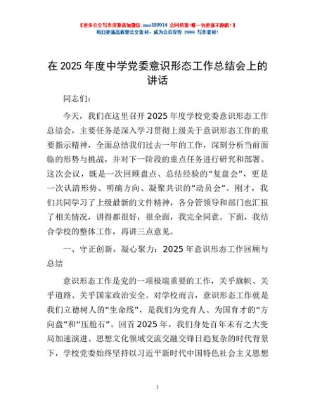 / 在2025年度中学党委意识形态工作总结会上的讲话