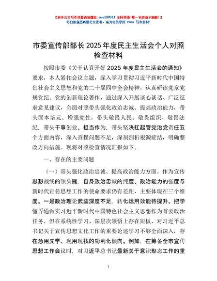 / 市委宣传部部长2025年度民主生活会个人对照检查材料