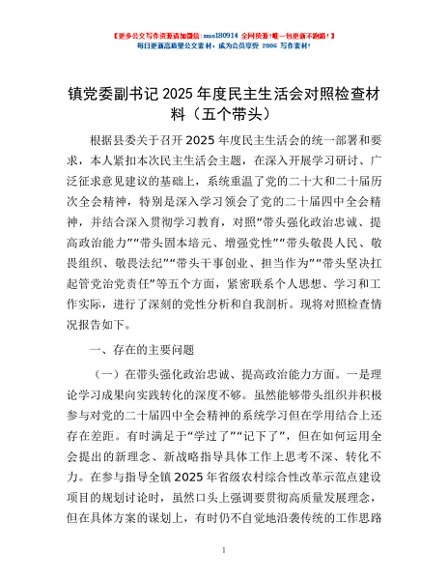 / 镇党委副书记2025年度民主生活会对照检查材料(五个带头)