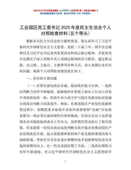 / 工业园区党工委书记2025年度民主生活会个人对照检查材料(五个带头)