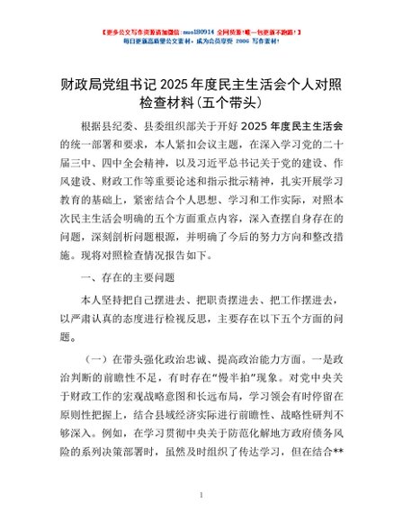 / 财政局党组书记2025年度民主生活会个人对照检查材料(五个带头)