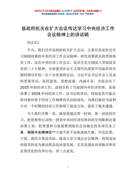 / 县政府机关在扩大会议传达学习中央经济工作会议精神上的讲话稿