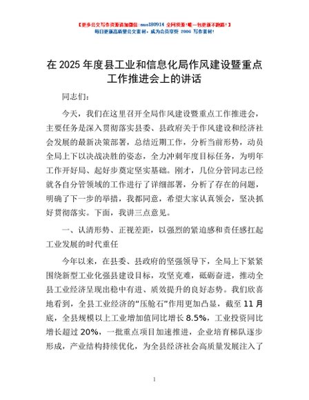 / 在2025年度县工业和信息化局作风建设暨重点工作推进会上的讲话