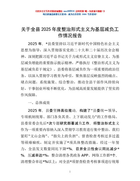/ 关于全县2025年度整治形式主义为基层减负工作情况报告