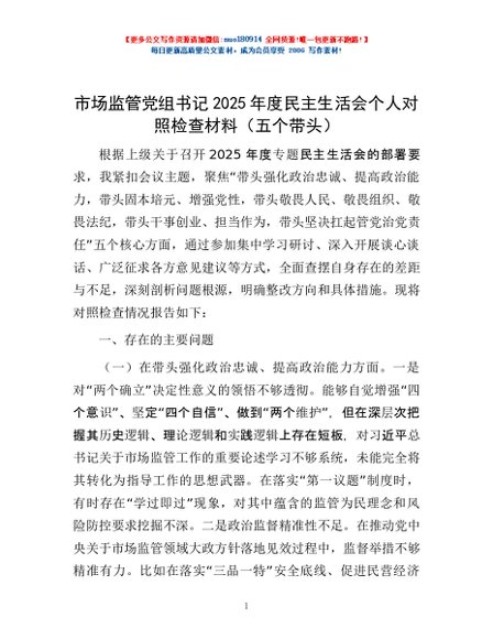 / 市场监管党组书记2025年度民主生活会个人对照检查材料(五个带头)