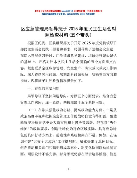 / 区应急管理局领导班子2025年度民主生活会对照检查材料(五个带头)
