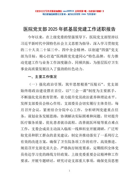 / 医院党支部2025年抓基层党建工作述职报告