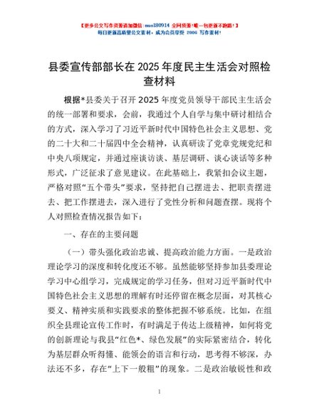 / 县委宣传部部长在2025年度民主生活会对照检查材料