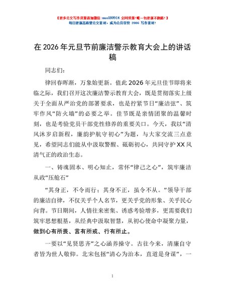 / 在2026年元旦节前廉洁警示教育大会上的讲话稿