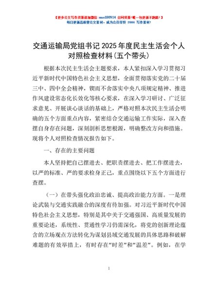 / 交通运输局党组书记2025年度民主生活会个人对照检查材料(五个带头)