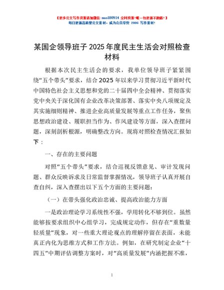 / 某国企领导班子2025年度民主生活会对照检查材料