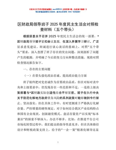 / 区财政局领导班子2025年度民主生活会对照检查材料(五个带头)