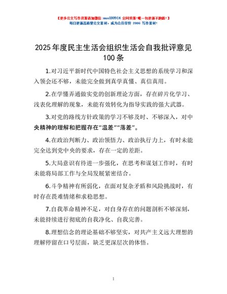 / 2025年度民主生活会 组织生活会自我批评意见 100条