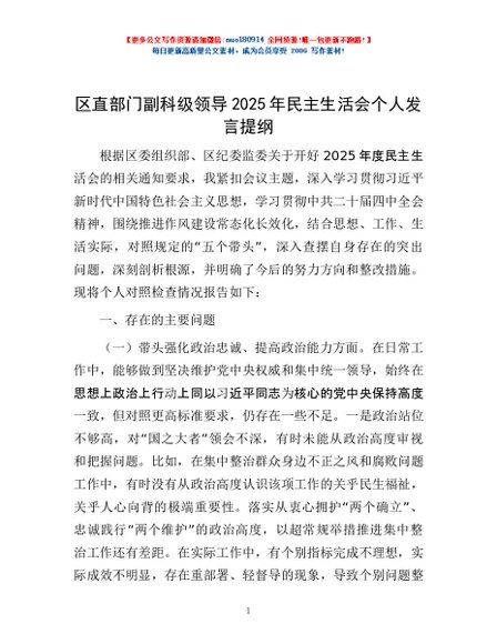 / 区直部门副科级领导2025年民主生活会个人发言提纲