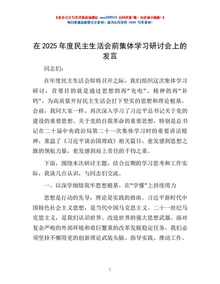 / 在2025年度民主生活会前集体学习研讨会上的发言