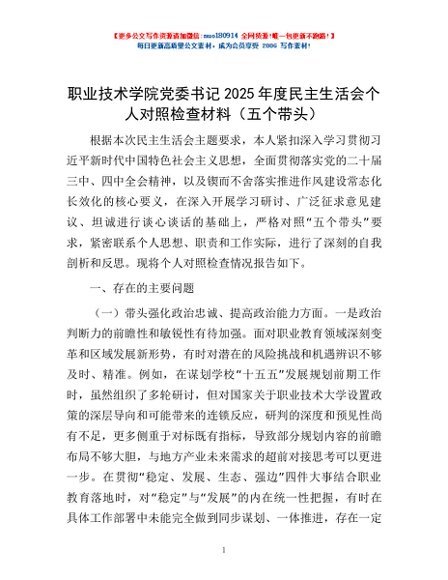 / 职业技术学院党委书记2025年度民主生活会个人对照检查材料(五个带头)