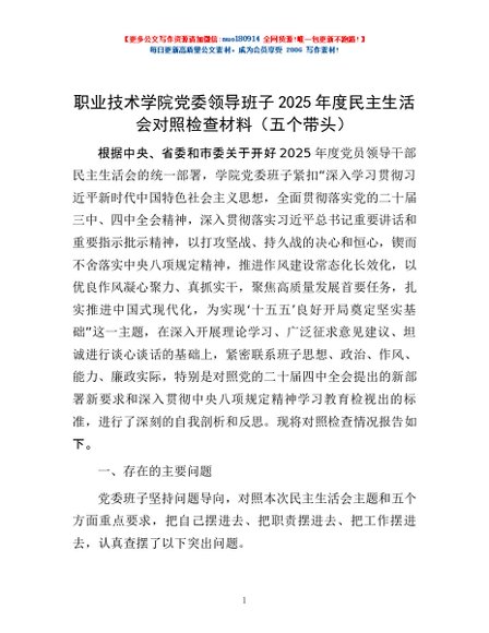 / 职业技术学院党委领导班子2025年度民主生活会对照检查材料(五个带头)