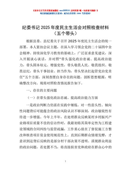 / 纪委书记2025年度民主生活会对照检查材料(五个带头)