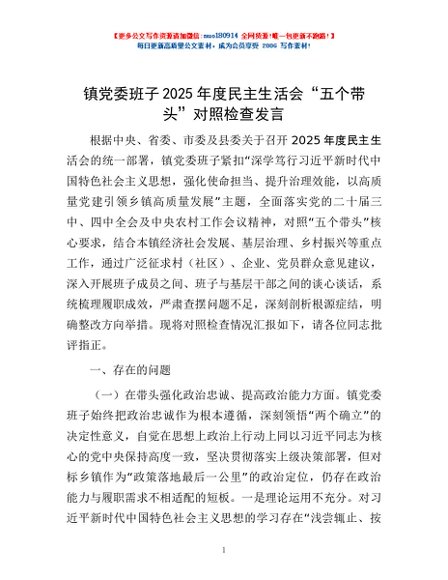 / 镇党委班子2025年度民主生活会“五个带头”对照检查发言