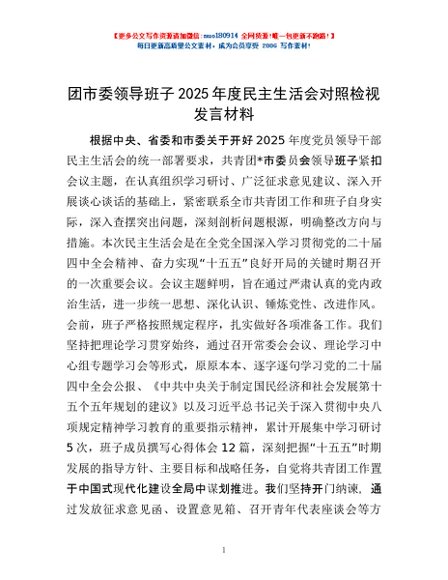 / 团市委领导班子2025年度民主生活会对照检视发言材料