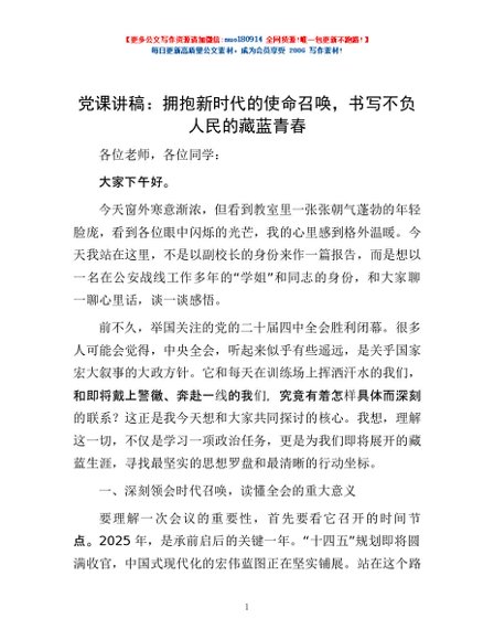/ 党课讲稿:拥抱新时代的使命召唤,书写不负人民的藏蓝青春
