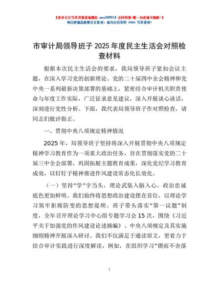 / 市审计局领导班子2025年度民主生活会对照检查材料