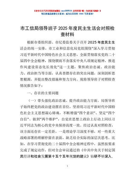 / 市工信局领导班子2025年度民主生活会对照检查材料