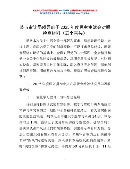/ 某市审计局领导班子2025年度民主生活会对照检查材料(五个带头)
