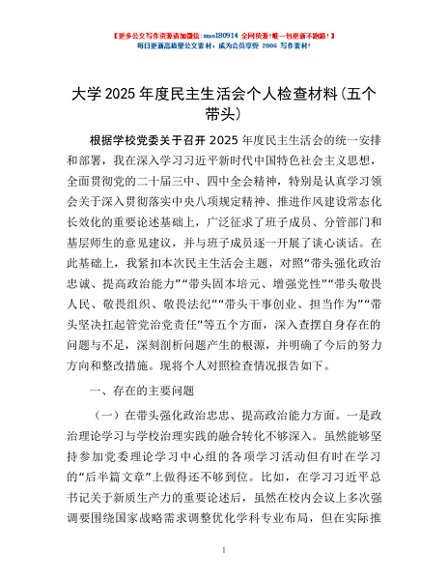 / 大学2025年度民主生活会个人检查材料(五个带头)